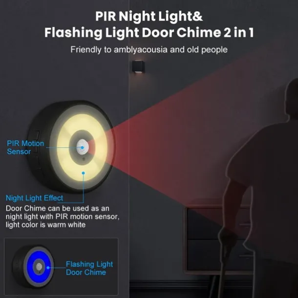7. PIR Night Light & Flashing Light Door Chime 2-in-1: The door chime flashes a blue light and rings when the doorbell is pressed. It can also function as a night light with motion detection PIR, making it friendly for people with hearing impairments and the elderly.