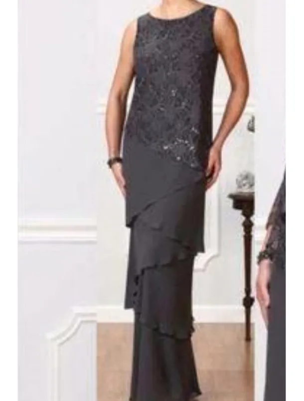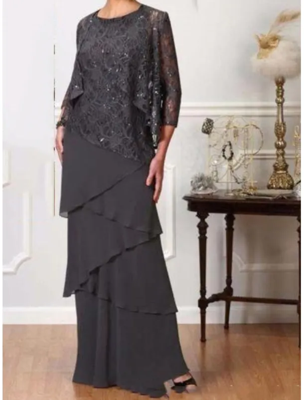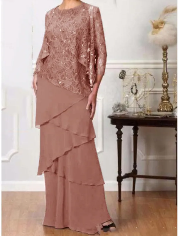 Two Piece A-Line Mother of the Bride Dress Elegant Jewel Neck Floor Length Chiffon 3/4 Length Sleeve with Cascading Ruffles