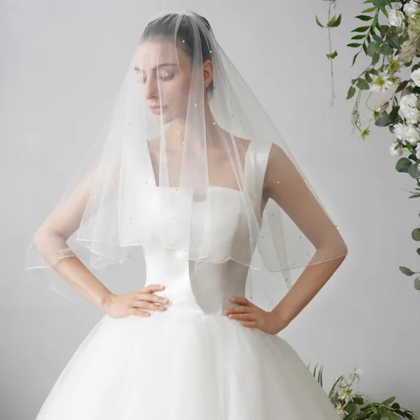 Two-tier Pearls Wedding Veil Fingertip Veils with Faux Pearl 84.65 in (215cm) Tulle