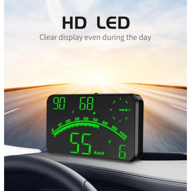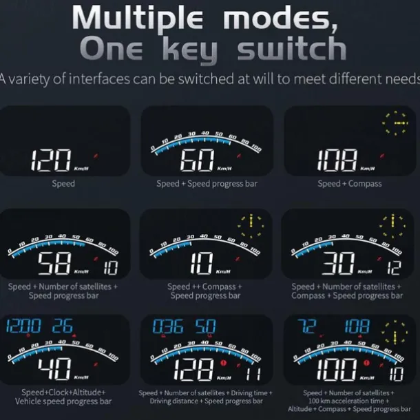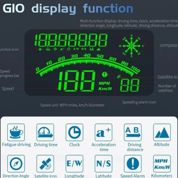 – Multi-functional display: Displays various information such as speed KM/H & MPH, clock, compass, travel time, travel distance, number of satellites, acceleration time, latitude, longitude, altitude, fatigue driving, and speeding alarm icon.
