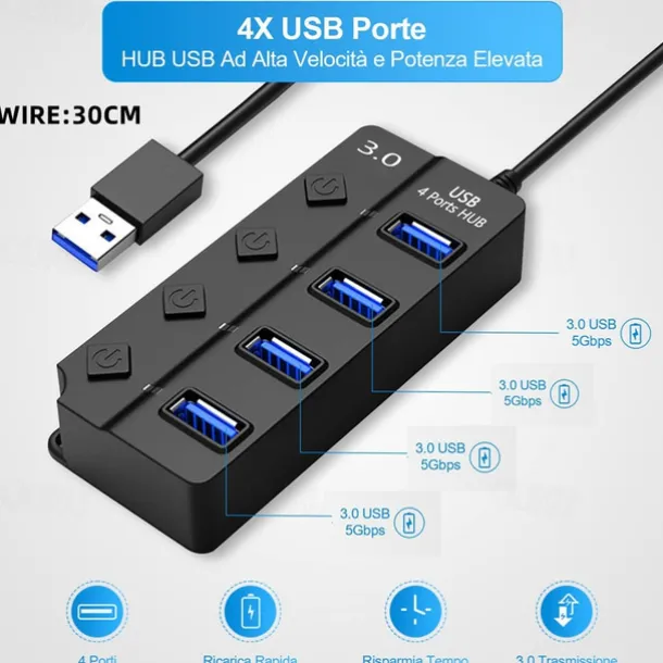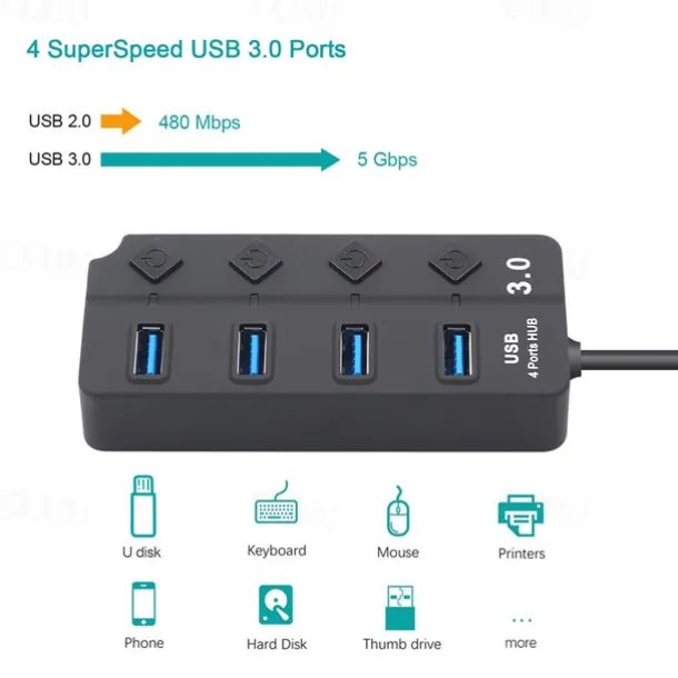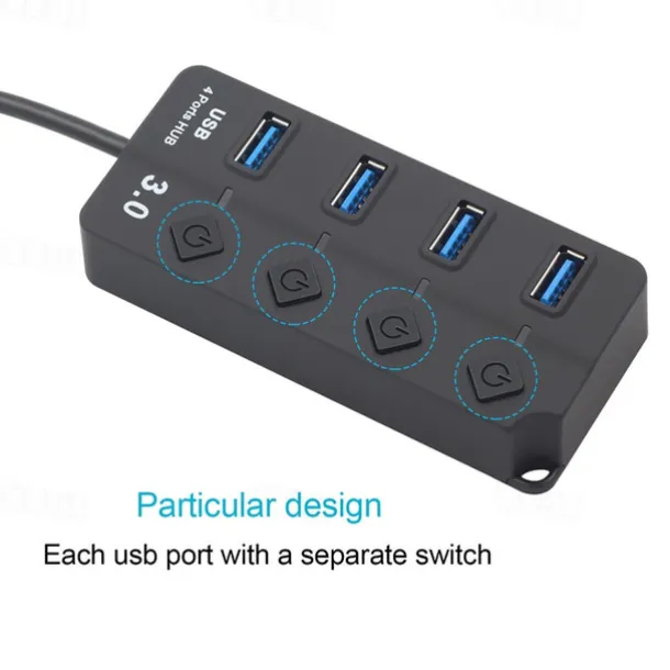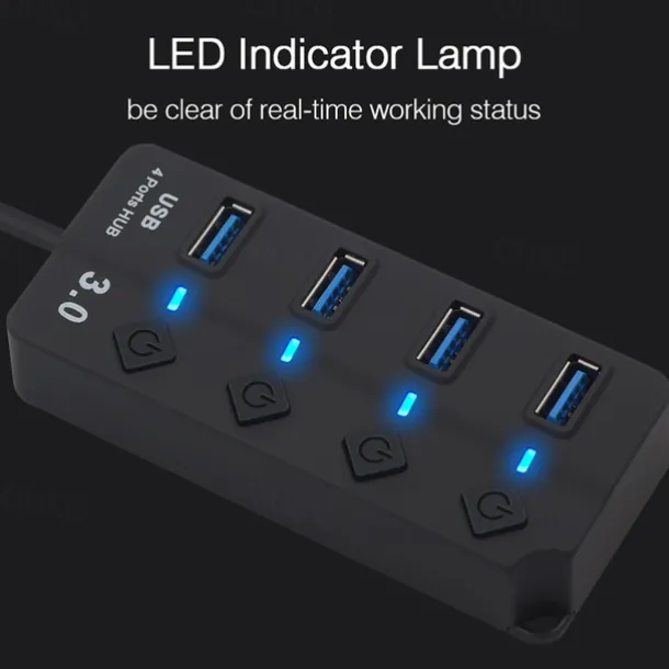USB Hub 4 Port USB 3.0 Hub with Individual LED Switch Portable Adapter High Speed Expansion Multi USB Hub Splitter Adapter