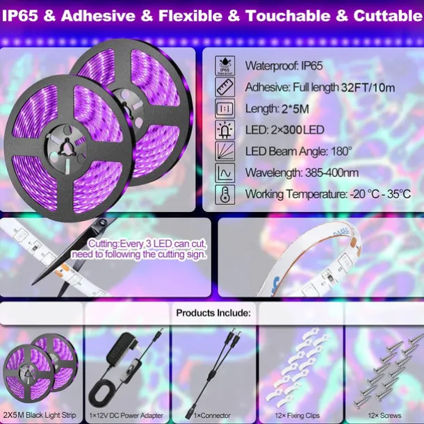LED Beads Quantity: 300/600, Light Color: Purple, Power Supply: Plug, Type: Light Sets, Style: LED Strip Light, Features: Waterproof, Halloween, Holiday, Self-adhesive, Outdoor, Quantity: 1 set, Wattage (W): 24, 12, Voltage (V): 100-240, 12, Length: 10m, 5m, Mode: 1(On / OFF), CRI: >70, LED Type: 2835 SMD, Batteries Included: No, IP Rating: IP20, IP65, Occasion: Outdoor, Party / Banquet, Indoor, Window / Curtain / Wall, Eaves / Roof, Prom / Ceremony, Length Range: 5~9m (16.4~29.5ft), Control Mode: Mode Switching, Width: 8mm, Suitable Rooms: Indoor, Outdoor, What’s in the box: 1Set Mounting Bracket, 1 x 2A power adapter,