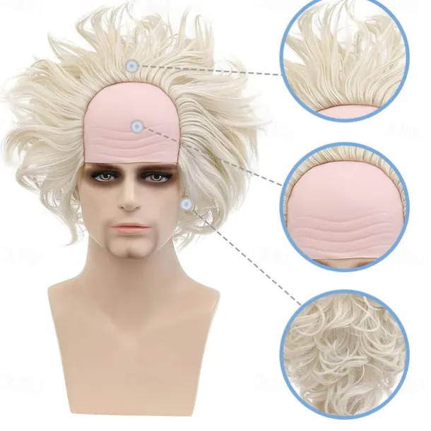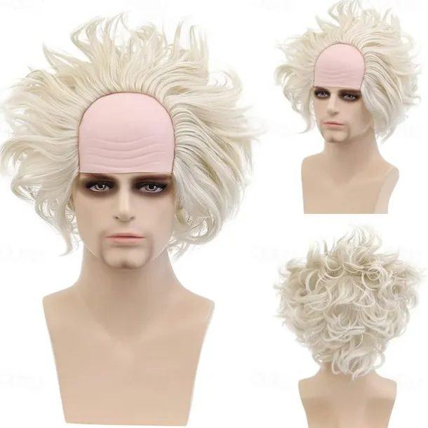 White Wig Men, Short Wavy Bald Wig Messy Mad Scientist Wig Old Man Wig Fluffy Crazy Funny Wig Halloween Wigs