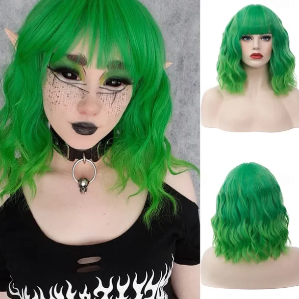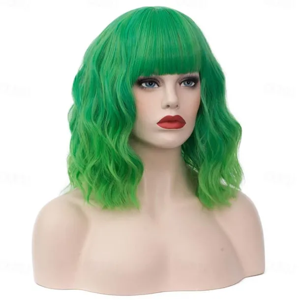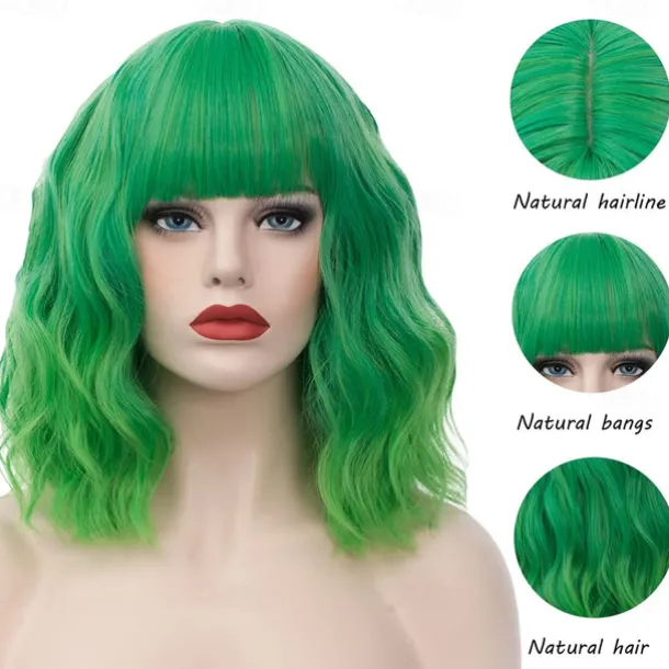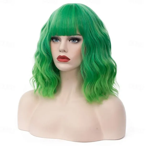 Women’s Bright Green Ombre Wig Short Curly Wavy Wig Shoulder Length Flat Bangs Wig For Women Girl Cosplay Party Halloween Wig Cap Included St.Patrick’s Day Wigs