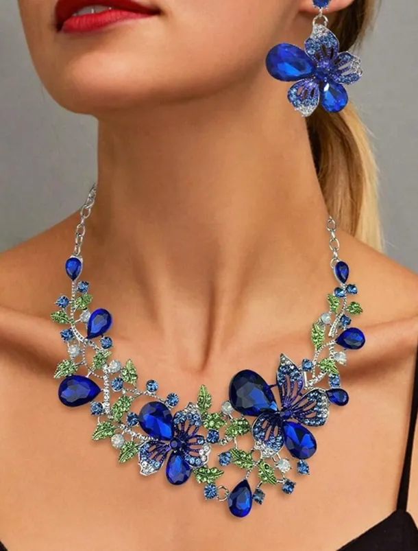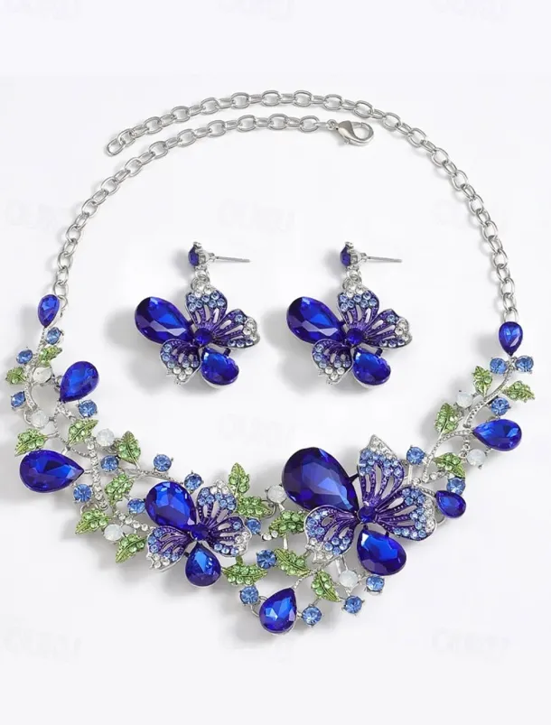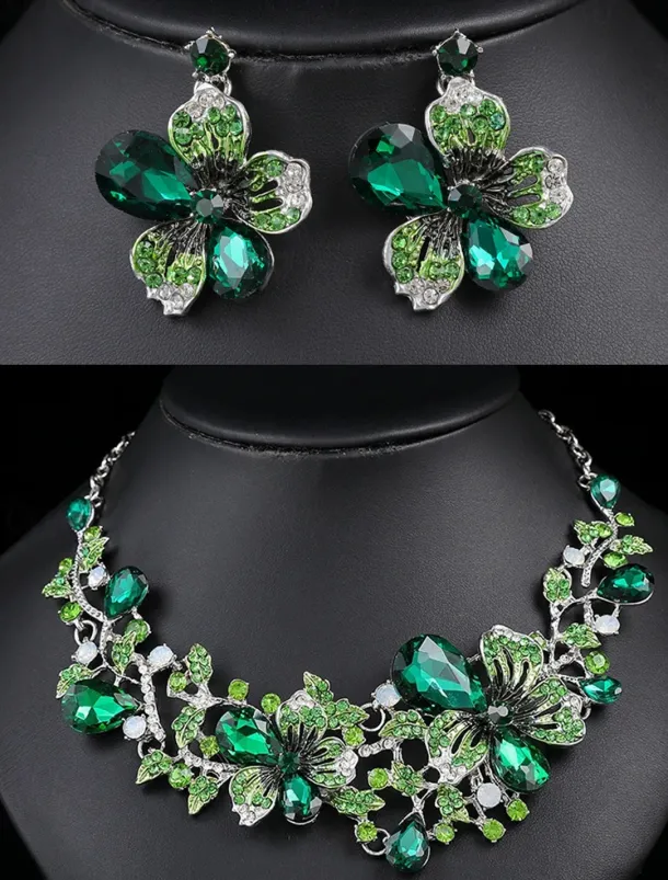 Women’s Elegant Green Butterfly Jewelry Set – Sparkling Crystal Necklace and Earring Set with Floral Design for Special Occasions