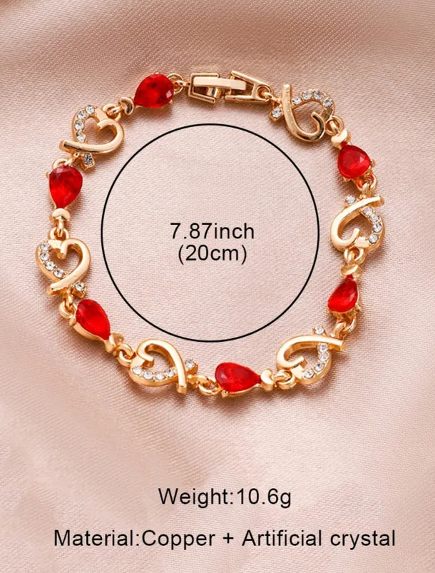 Women’s Gold Bracelet with Red Teardrop Crystals and Heart-Shaped Accents, Elegant Romantic Design for Valentine’s Day Gift, Weddings, and Special Occasions