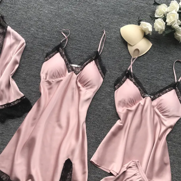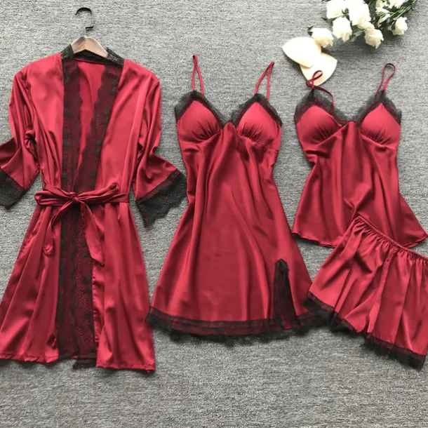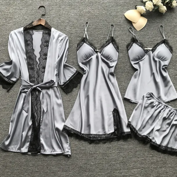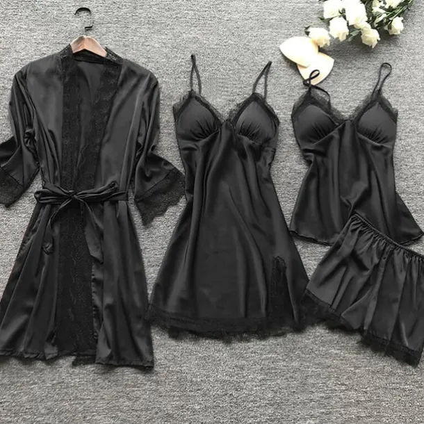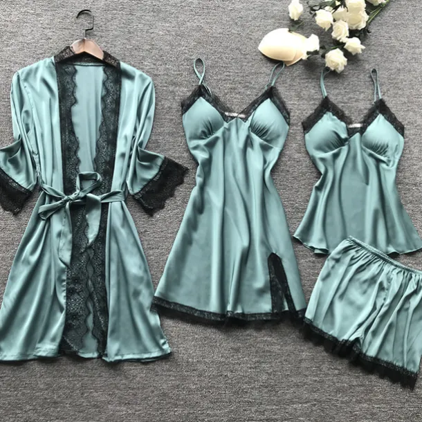– This 4-piece sleepwear set includes a camisole, shorts, sleepwear dress, and a night robe all made with super soft and breathable pure satin material.