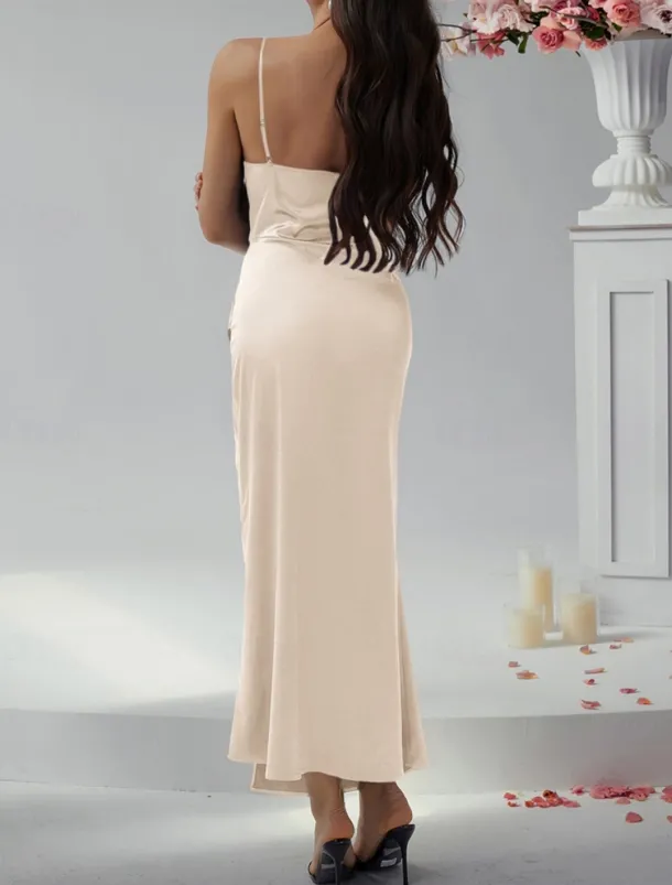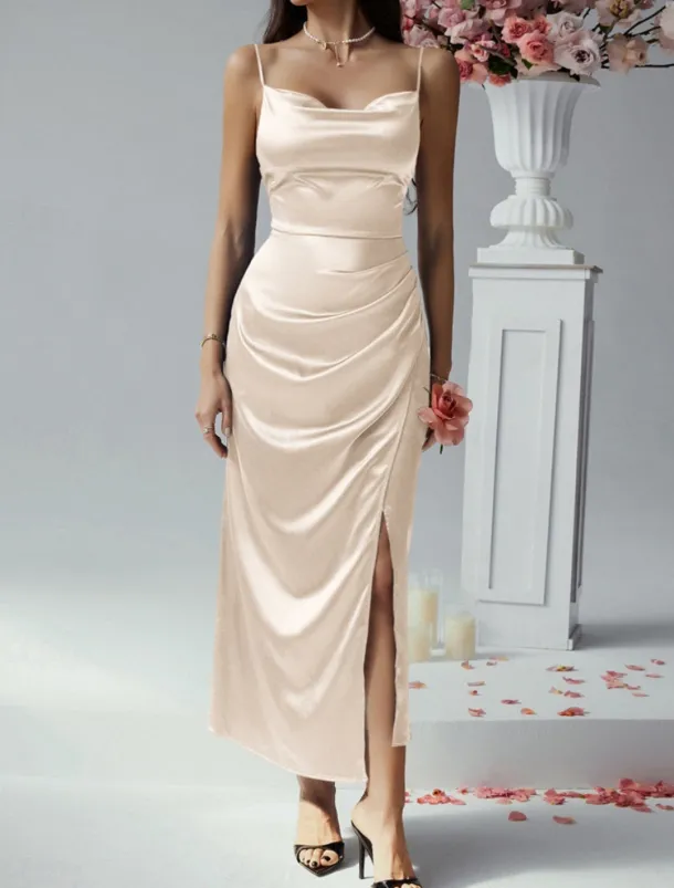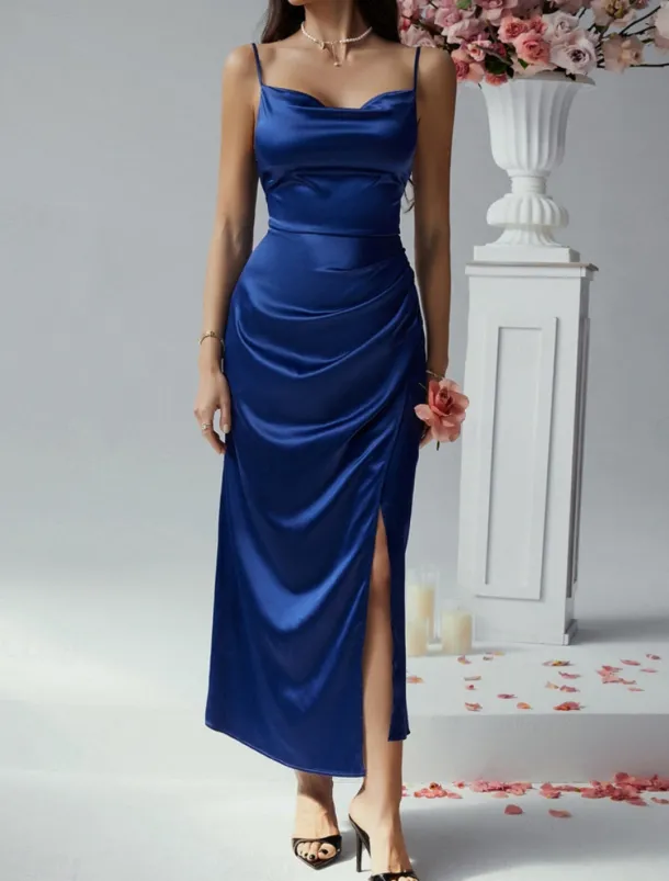 – Look elegant and stylish in this sleeveless satin dress designed for summer occasions