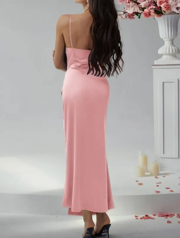 – Features a backless design and spaghetti strap neckline for a glamorous look
