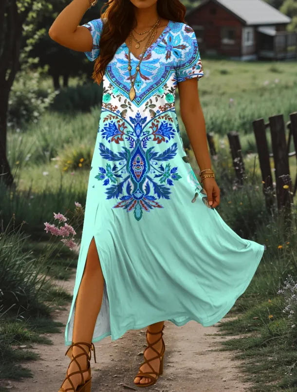 Women’s Maxi Dress Sundress A Line Dress Vacation Casual Beach Regular Fit Graphic Tribal Short Sleeve V Neck Pink Blue Purple Green Summer Spring