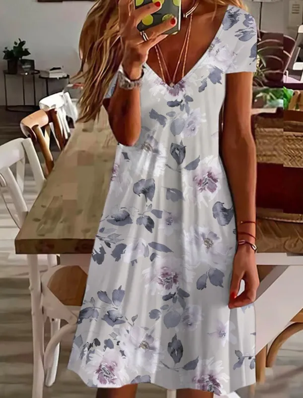 The Women’s Floral Print V-Neck Dress is your top choice for chic spring and summer style Made with comfortable slightly stretchy polyester this fashionable mini dress is just right for any occasion – from day trips to weekend nights out Pair it effortlessly with your favorite accessories this machine-washable dress features a classic regular fit and short sleeves design making it a timeless addition to your wardrobe