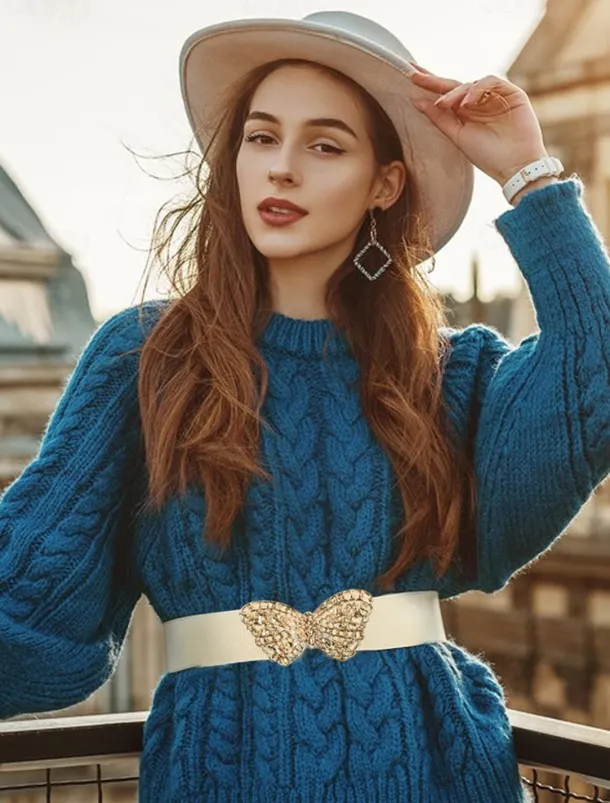 Women’s Navy Blue Elastic Waist Belt with Gold Butterfly Buckle | Perfect for Dresses and Skirts