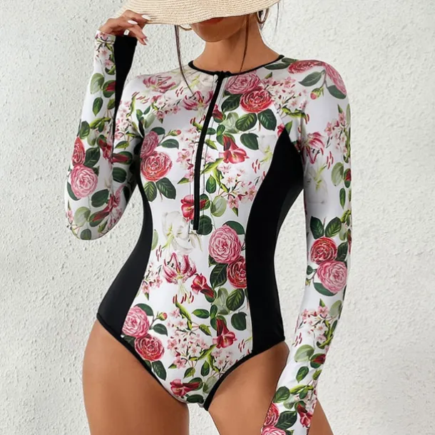 Women’s Rash Guard One Piece Swimsuit Lightweight Sleeveless Bodysuit Bathing Suit Front Zip Swimming Surfing Beach Water Sports Floral Printed Summer Spring Autumn