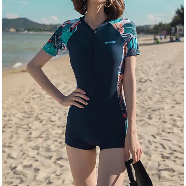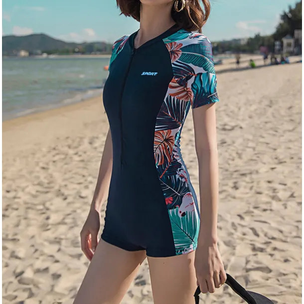 Women’s Rash guard Swimsuit UV Sun Protection Breathable Quick Dry Short Sleeve Swimwear Bathing Suit Front Zip Swimming Surfing Water Sports Floral Summer