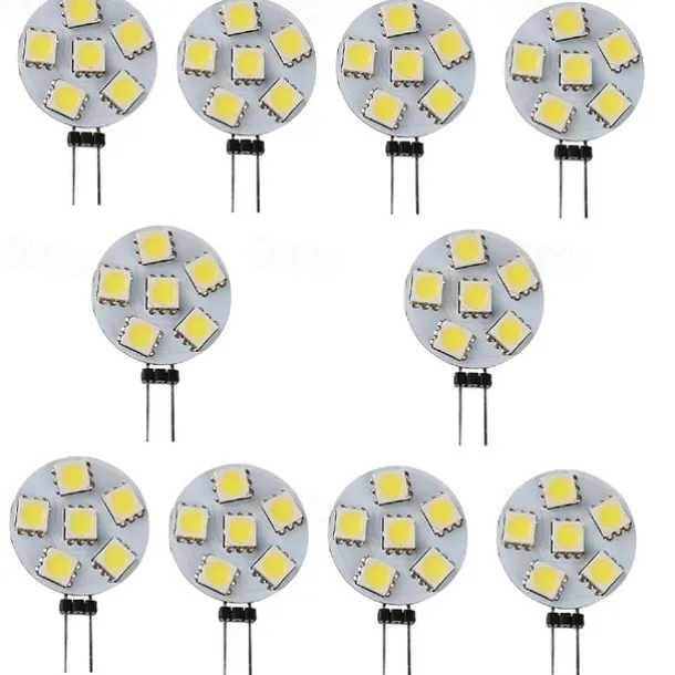 Quantity: 10pcs, LED Beads Quantity: 6, Light Color: White, Warm Yellow, Type: LED Bi-pin Lights, Wattage (W): 1, Initial Lumens (lm): 120, Color Temperature (k): 3000 6000, Lifetime (H): >30000, Primary Application: Living Room / Dining Room, Bedroom, LED Type: SMD 5050, Bulb Base: G4, Net Weight (kg): 0.018, Dimension (cm): 3.7*2.3*0.5,