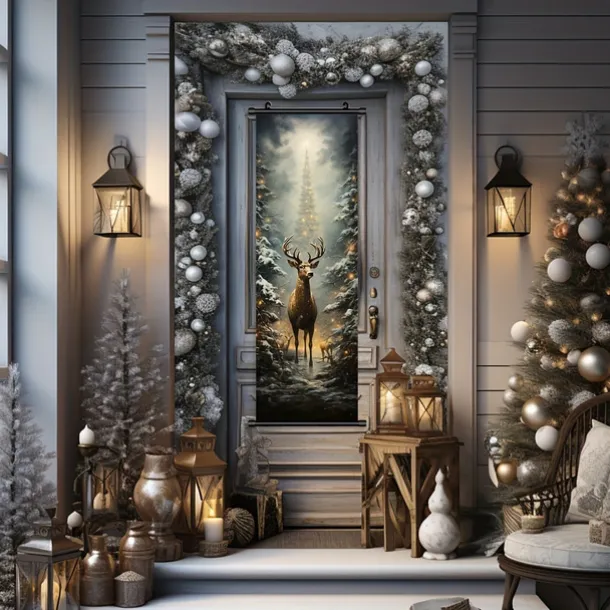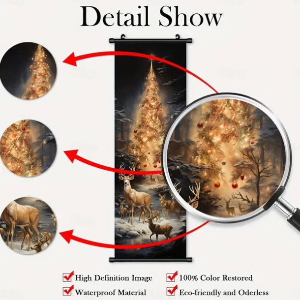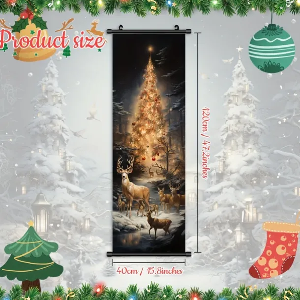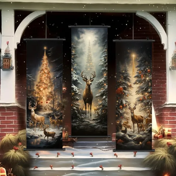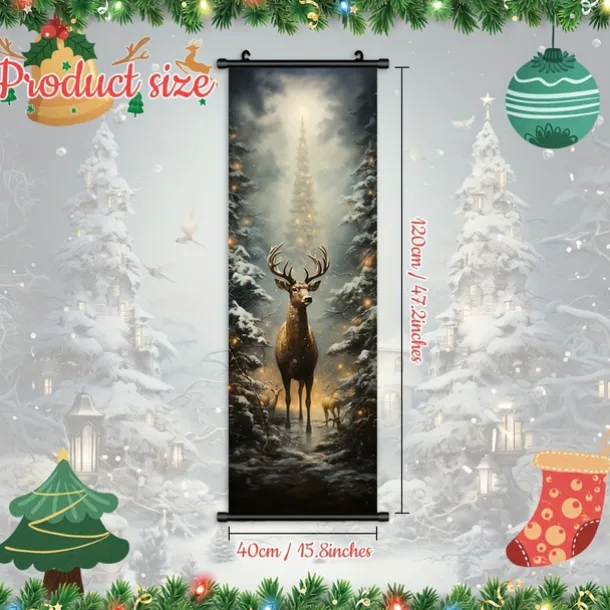 1pc Christmas Poster with Hangers Courtyard Christmas Deer And Colorful Christmas Tree Wall Art Canvas Posters Art For Home Living Room Decoration Wall Art Decor