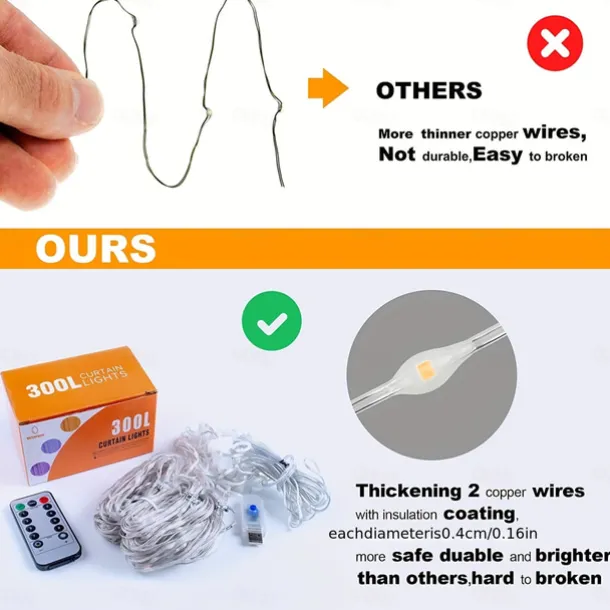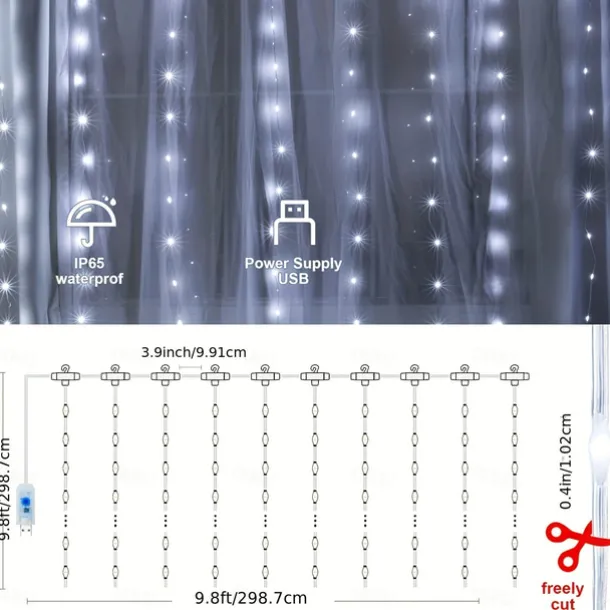 1pc Curtain Lights 300 LED Curtain Fairy Lights with Remote 8 Modes 9.8 9.8 Ft Curtain String Lights Waterproof USB Plug In Copper Wire Lights For Bedroom Window Chrismas Wedding Party