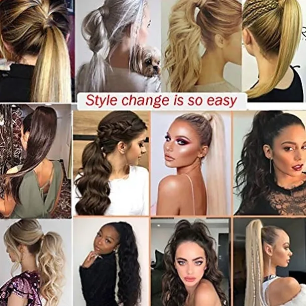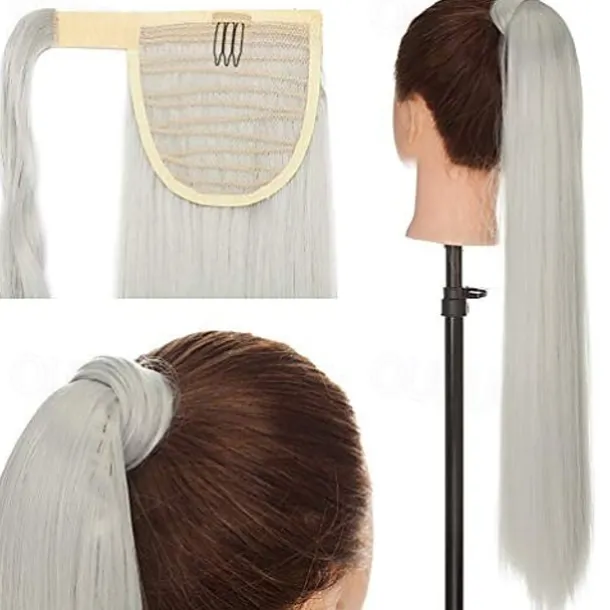 26″ long straight wrap around ponytail extensions synthetic clip in ponytail hair extensions hairpiece – silver gray