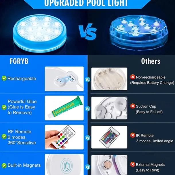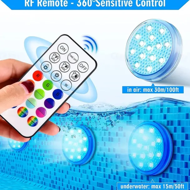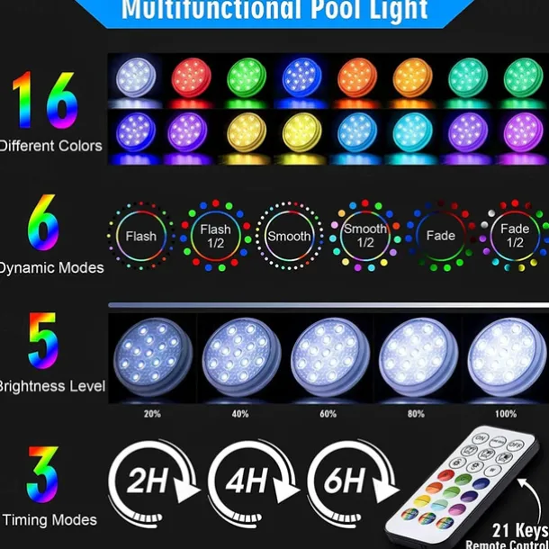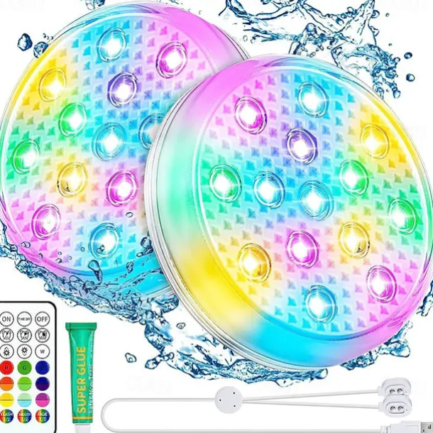 Quantity: 2pcs, LED Beads Quantity: 14, Light Color: Change, Type: Underwater Lights, Features: Color Gradient, Waterproof, Remote Controlled, Decorative, Multi-function, Wattage (W): 5, Voltage (V): 3.2, Certification: CE Certified, Lifetime (H): >45000, CRI: >70, Fixture Material: Plastic, Shade Material: Plastic, Primary Application: Swimming pool, Garden, Courtyard, Outdoor Lighting, LED Type: SMD 2835, IP Rating: IP65, Accessories Included: Remote Control,