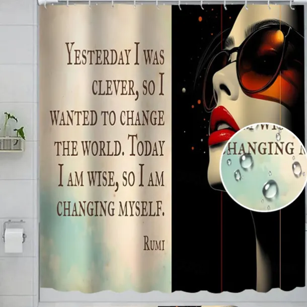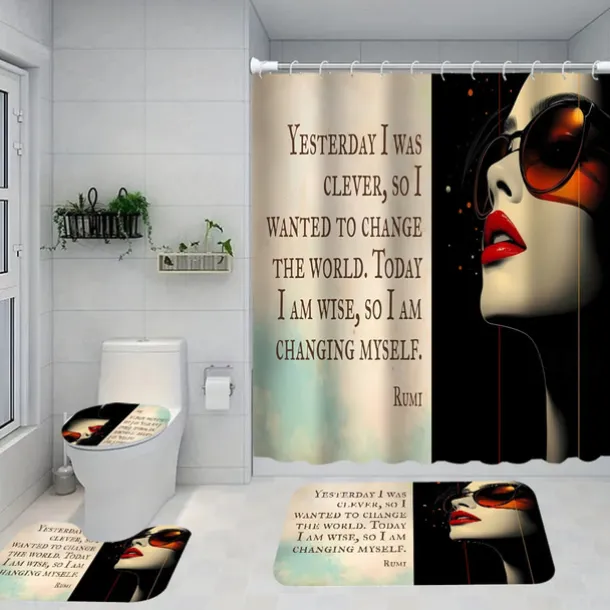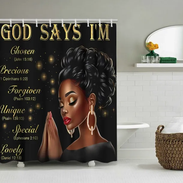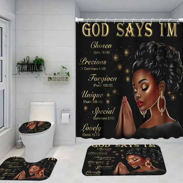 4-Piece Bathroom Set, Waterproof Polyester Shower Curtain with 12 Hooks, Non-Slip Toilet Seat Cover & Sturdy Bath Mat, Fashionable African American Women Design for Home Decor