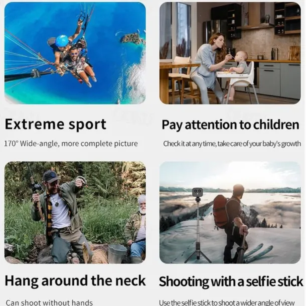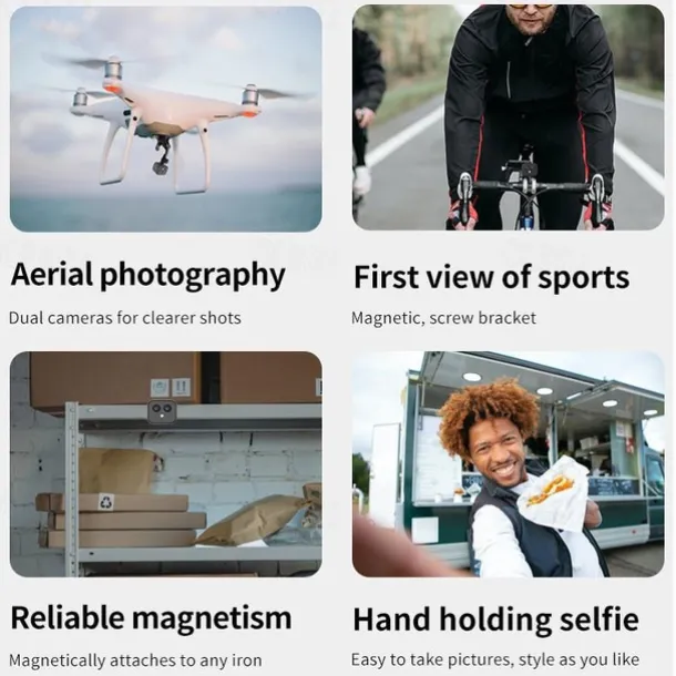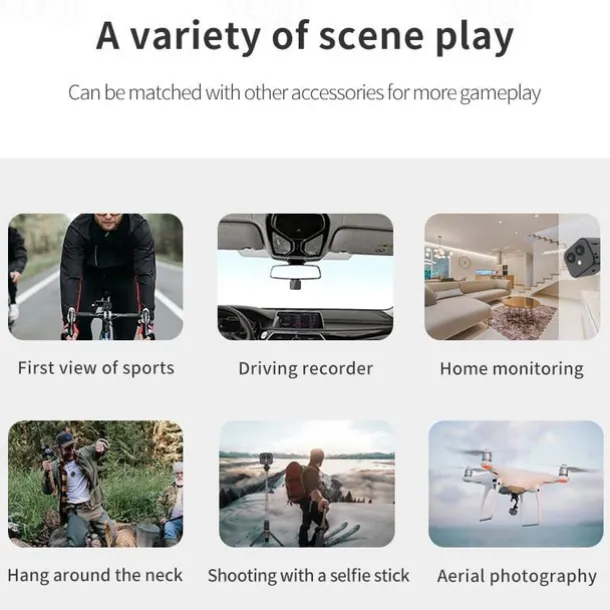 Cycling and motorcycle riding, outdoor extreme sports skydiving and jumping on the helmet, aerial camera, driving recorder, store monitoring, warehouse video, real-time babysitting for the elderly (using mobile phones to remotely check the status of children and elderly at home when not at home) Family living room room Monitoring, corridor monitoring, home door monitoring, office, travel, conference, classroom, pet care, can be magnetically attached to refrigerators, warehouse iron shelves, and other iron products