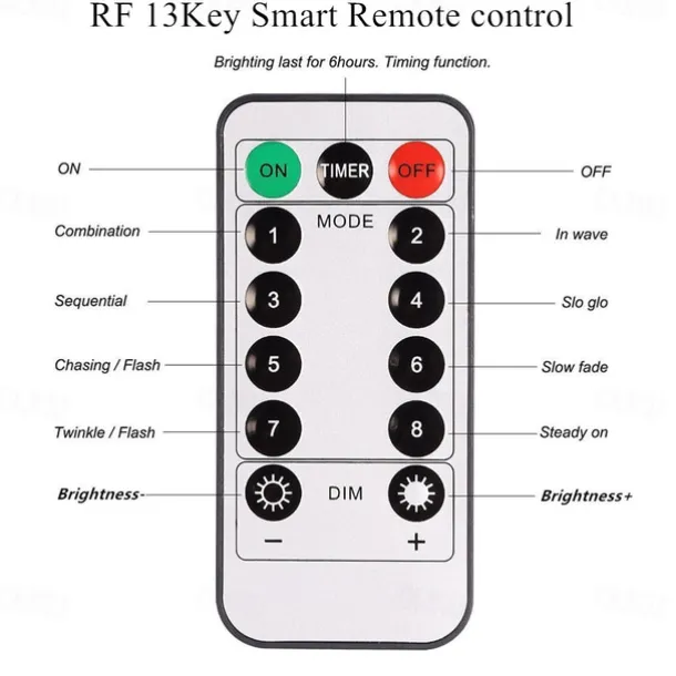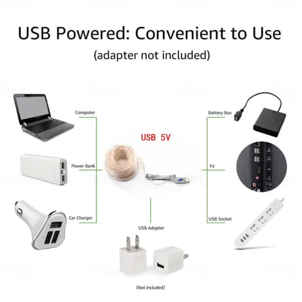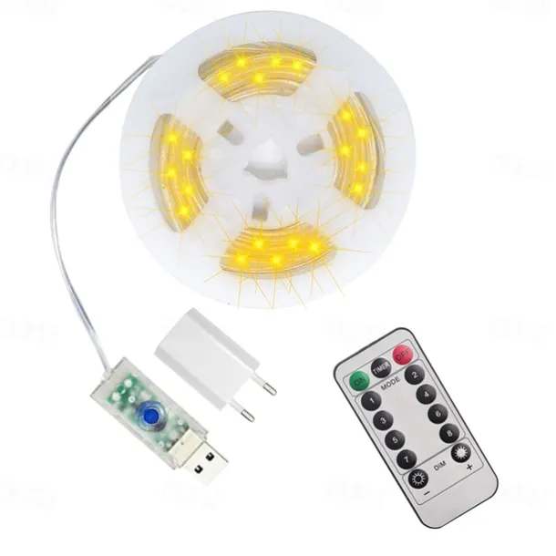 LED Beads Quantity: 50, Light Color: Warm White, Power Supply: USB, Type: String Lights, Style: Copper Wire Lights, Features: Outdoor, Waterproof, USB, TV Background, Christmas Wedding Decoration, Quantity: 1 set, Wattage (W): 3, Voltage (V): 5, Initial Lumens (lm): 3000, Length: 5m, Mode: 8 Modes: (1.Combination 2.Wave 3.Sequential 4.Glow 5.Flash 6.Slow Fade 7.Twinkle 8.Continuous), Batteries Included: Yes, IP Rating: IP65, Control Mode: Button, Remote Control, Suitable Rooms: Dorm, Shape: Wire, What’s in the box: 1 13Keys Remote Controller,