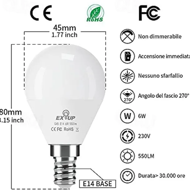 Quantity: 6pcs, LED Beads Quantity: 20, Light Color: Warm White, Cold White, Type: LED Globe Bulbs, Features: Decorative, Wattage (W): 6, Voltage (V): 220-240, Initial Lumens (lm): 550, Color Temperature (k): 2700-6500, Lifetime (H): >25000, Beam Angle: 270°, CRI: >80, Primary Application: Living Room / Dining Room, Bedroom, Children’s Room, Home / Office, Bulb Shape: G45, LED Type: SMD 2835, Bulb Base: E14, Net Weight (kg): 0.106, Accessories Included: English Manual, Dimension (cm): 8*4.5,