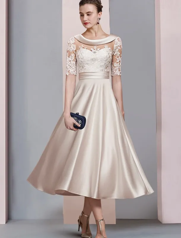 A-Line Gold Mother of the Bride Dress Wedding Guest Elegant Vintage Scoop Neck Tea Length Satin Lace Half Sleeve with Ruched Appliques free custom size