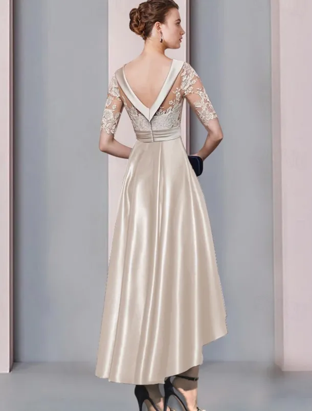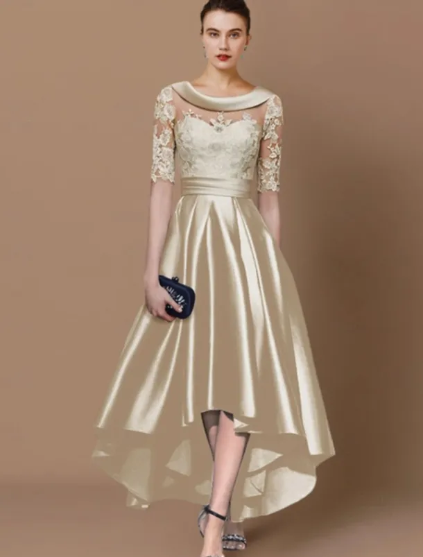 A-Line Mother of the Bride Dress Wedding Guest Elegant High Low Scoop Neck Asymmetrical Tea Length Satin Lace Half Sleeve with Appliques Race Day Dress free custom size