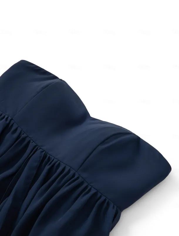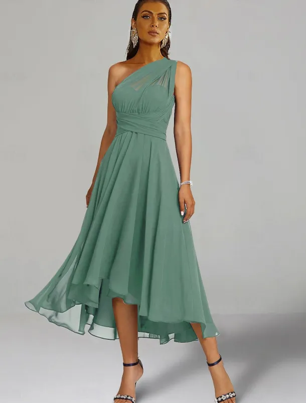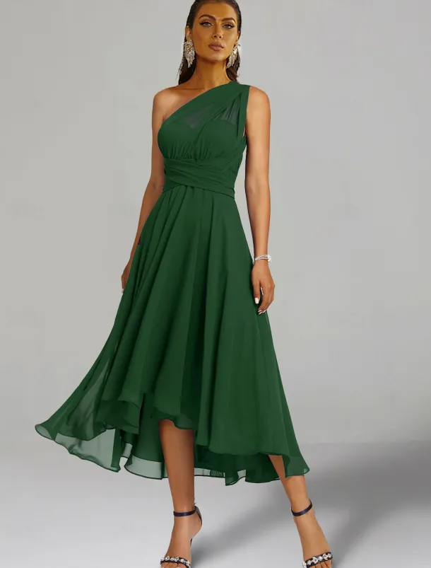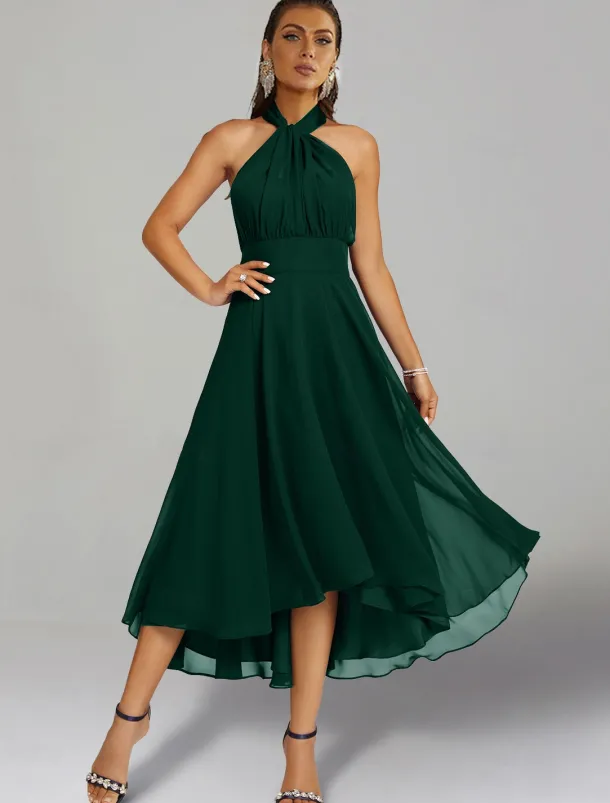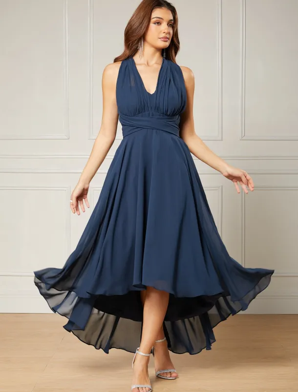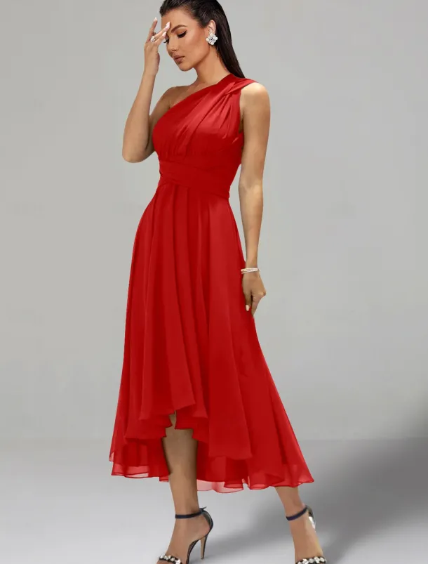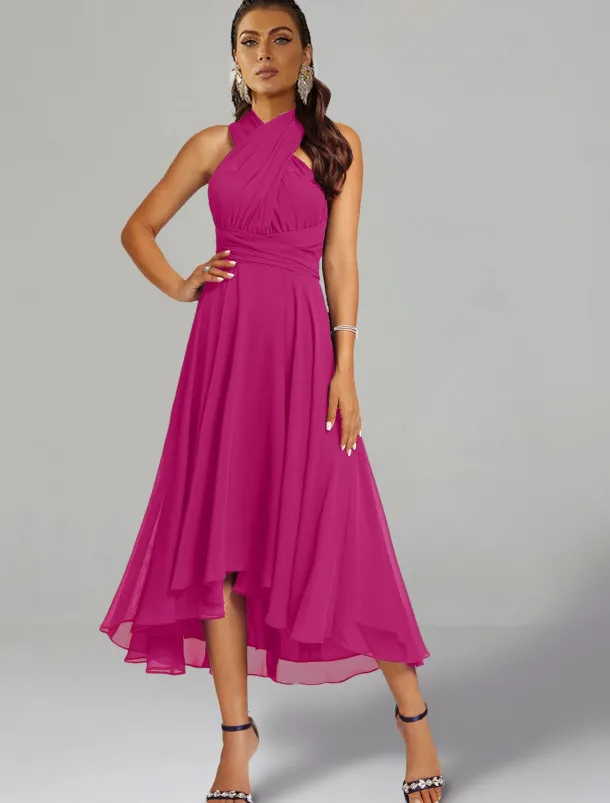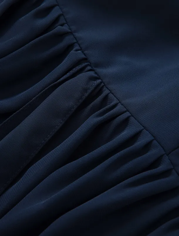 – The solid color design, along with draping, ruching, and pleats, gives this dress a stylish and unique look.