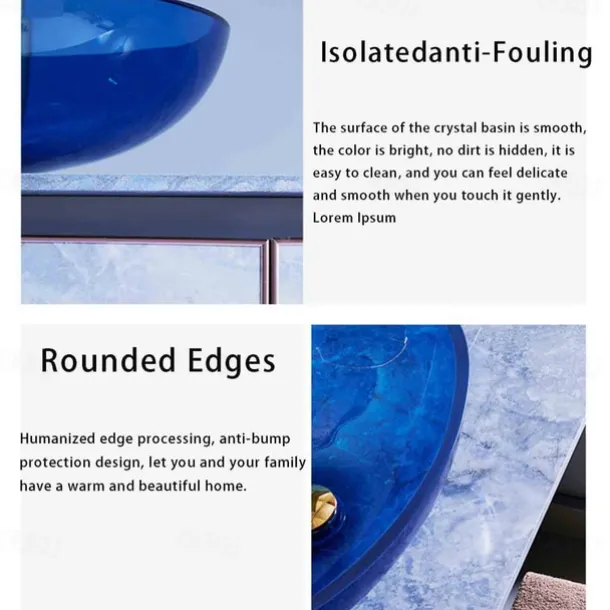 Style: Contemporary, Sink Finish: Tempered Glass, Faucet Finish: Chrome, Water Drain Finish: Chrome, Mounting Ring Finish: Chrome, Sink Material: Tempered Glass, Water Drain Material: Brass, Mounting Ring Material: Zinc Alloy, Sink Shape: Round, Faucet Body Material: Brass, Shipping Weight (kg): 10, Function: Combo, Dimension (cm): 42*42*14.5, What’s in the box: Bathroom Sink, Bathroom Water Drain, Bathroom Mounting Ring, Bathroom Faucet,