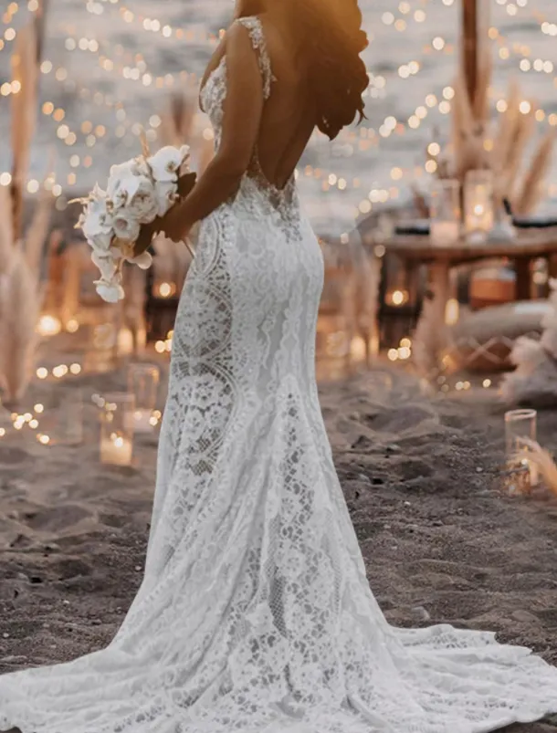 Be the first to review “Beach Wedding Beach Open Back Sexy Boho Wedding Dresses Mermaid V Neck Sleeveless Court Train Lace Bridal Gowns With Appliques” Cancel reply