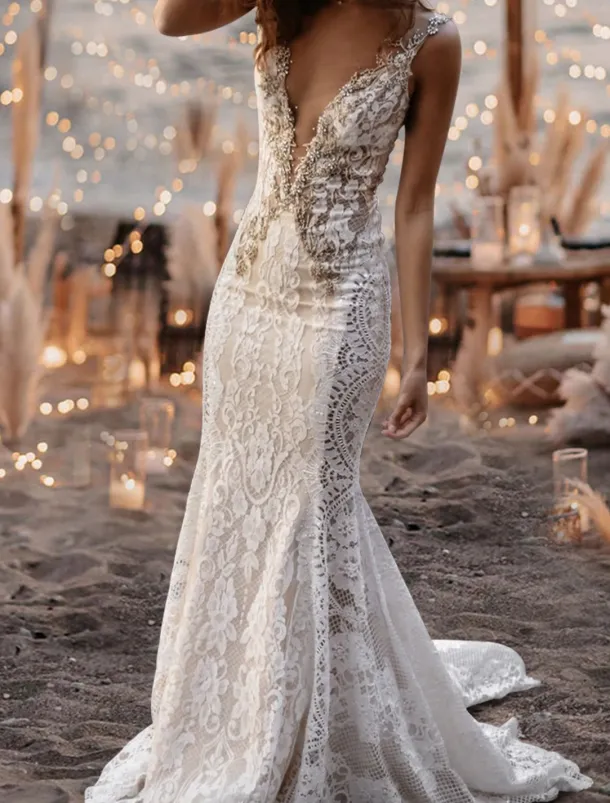 Beach Wedding Beach Open Back Sexy Boho Wedding Dresses Mermaid V Neck Sleeveless Court Train Lace Bridal Gowns With Appliques
