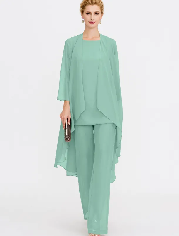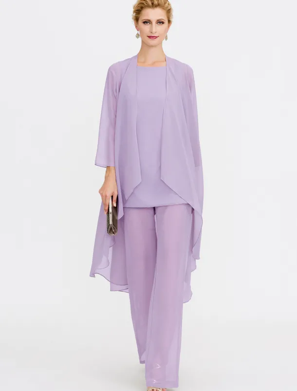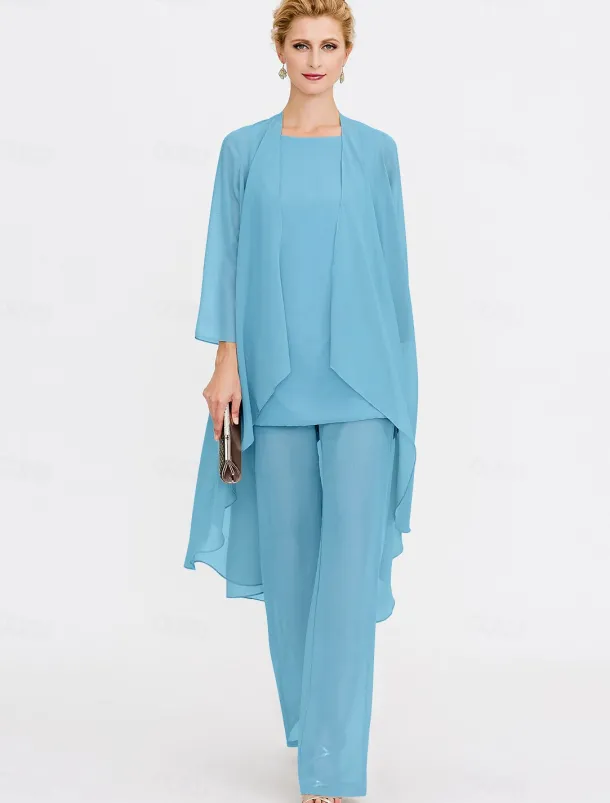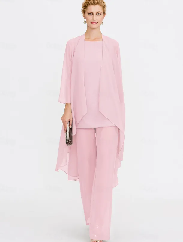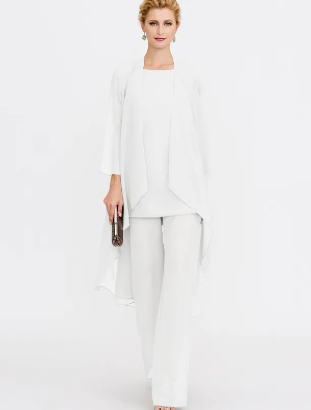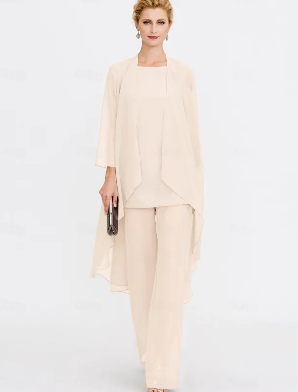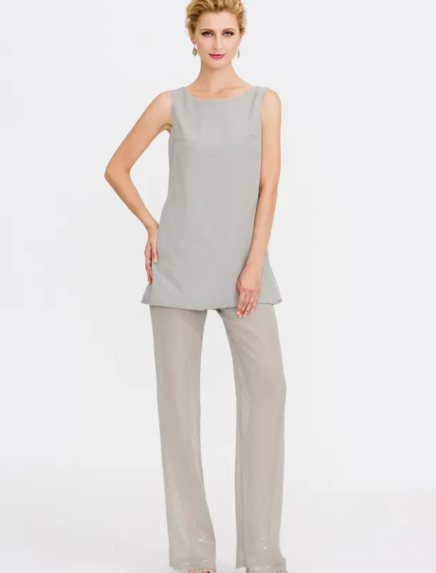 Beach Wedding Jumpsuit/Pantsuit 3 Piece Mother of the Bride Wedding Guest Elegant Plus Size Included Bateau Neck Floor Length Chiffon Sleeveless Jacket es with Solid Color