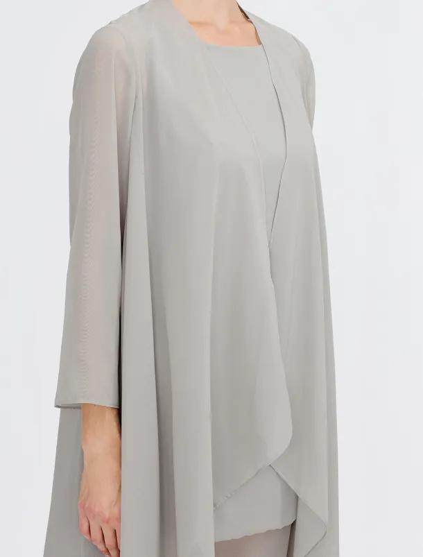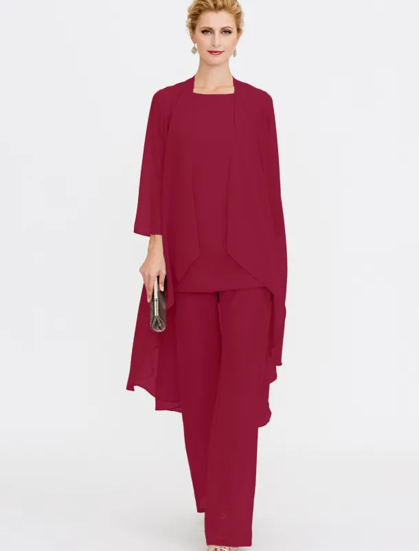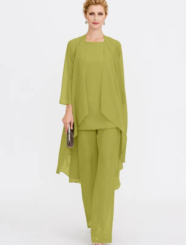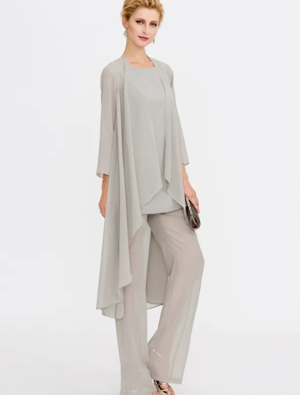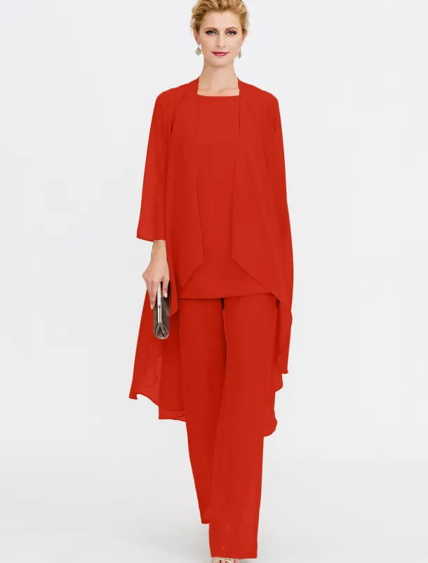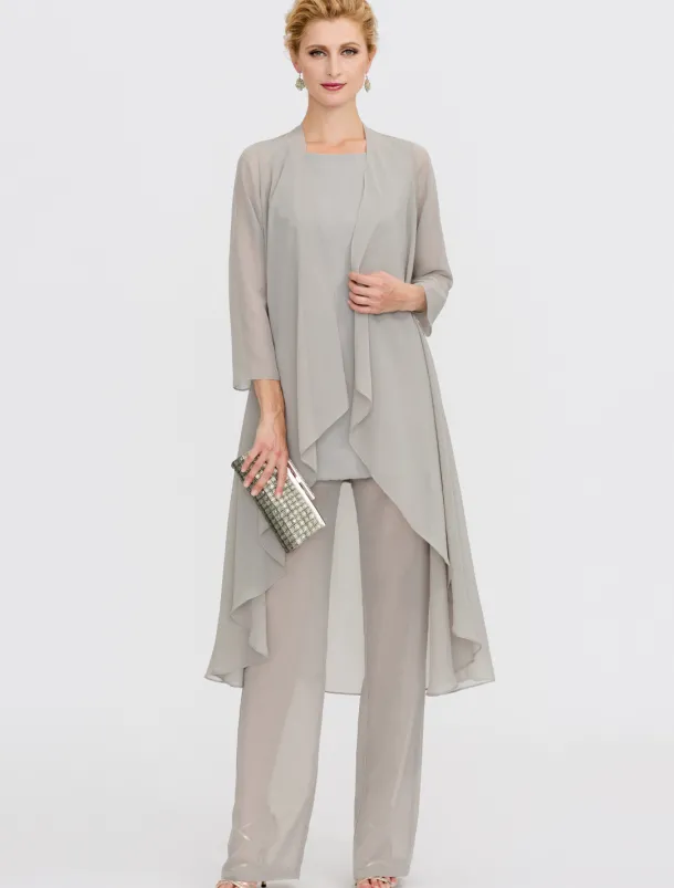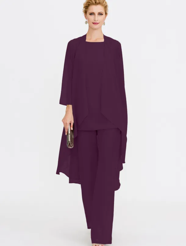 Beach Wedding Jumpsuit/Pantsuit 3 Piece Mother of the Bride Wedding Guest Elegant Plus Size Included Bateau Neck Floor Length Chiffon Sleeveless Jacket es with Solid Color