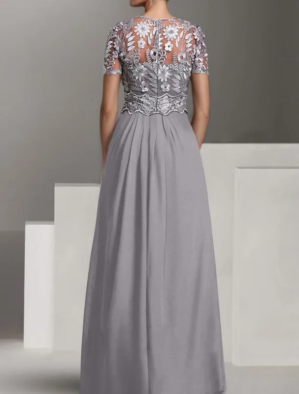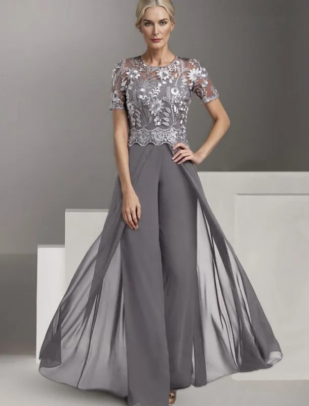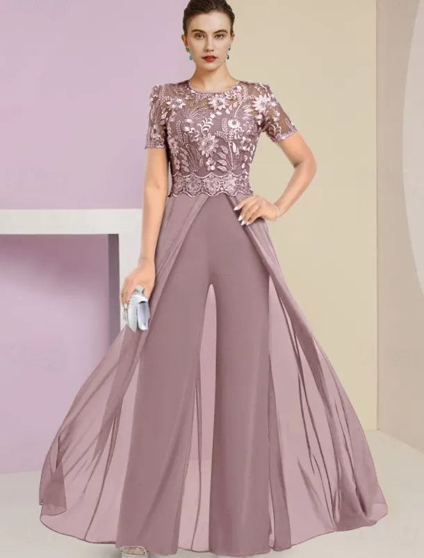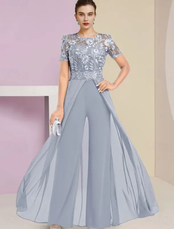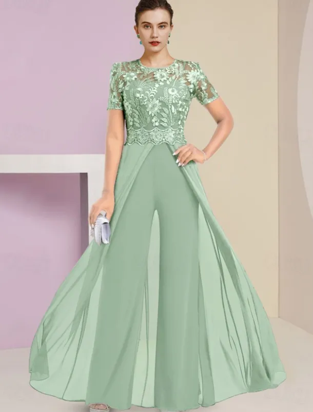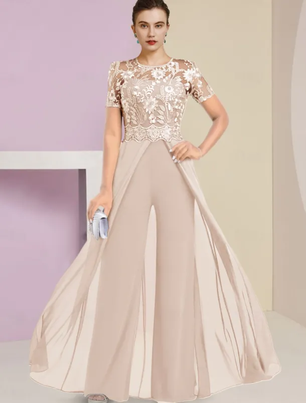 Beach Wedding Jumpsuit / Pantsuit Mother of the Bride Wedding Guest Elegant Jewel Neck Ankle Length Stretch Chiffon Short Sleeve with Lace Pleats free custom size