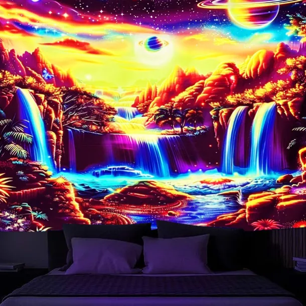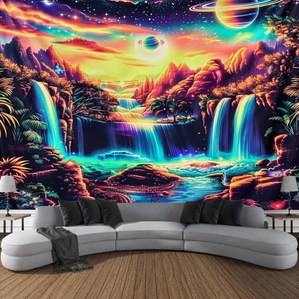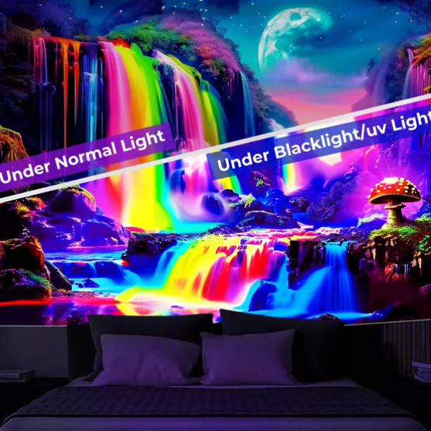 3. UV/Black Light Reactive:This glow in the dark tapestry glows under blacklight / UV light.In normal light, the colors also are full and vivid.