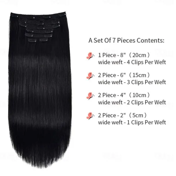 Hair Material: Human Hair, Texture: Silky Straight, Origin of Hair Donors: Brazilian Hair, Gender: Women, Features: Comfortable, Youth, Hair Extension Type: Clip In, Can Be Permed: Yes, Heat Resistant: Yes, Quantity: 7 Pcs,