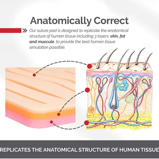 Introducing our Complete Suture Practice Kit for Suture Training! This kit offers a lifelike and soft surface for easy and realistic operation. It is perfect for teaching demonstrations and study practice, and provides an opportunity for medical technique exercises including cutting, suturing, and knotting. Our silicone pad is designed with a special mesh layer between the skin and fat layers to provide the best human tissue simulation possible. With 3 layers including skin, fat, and muscle, this suture pad is perfect for aspiring medical professionals to fully hone their skills. Plus, it’s incredibly easy to carry wherever you go. Order your kit now and start practicing!