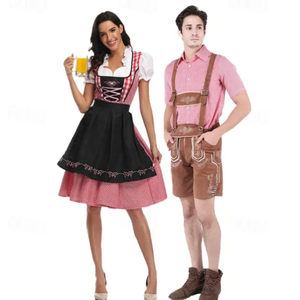 Couples Oktoberfest Beer Costume Blouse Shirt Dirndl Dress Lederhosen Bavarian Couple Oktoberfest Couple German Munich Wiesn Men’s Women’s Traditional Style Cloth Skirts Top Apron Halloween Carnival