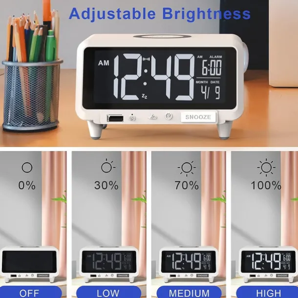 Digital Alarm Clock Wireless Charging for Smartphones with Bluetooth Speaker Alarms USB Charging Port Dimmer Nightlight for Bedroom