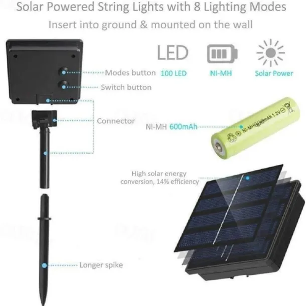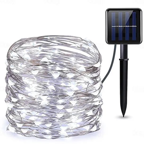 LED Beads Quantity: 100, Light Color: Warm White, RGB, Red, Blue, Green, Pink, White, Power Supply: Solar Energy, Type: String Lights, Style: Christmas, New Year’s, Copper Wire Lights, Features: Patio, Christmas Wedding Decoration, Solar, Waterproof, Quantity: 1PC, Wattage (W): 5, Voltage (V): Solar Powered, Initial Lumens (lm): 80, Length: 10m, Mode: 8 Modes: (1.Combination 2.Wave 3.Sequential 4.Glow 5.Flash 6.Slow Fade 7.Twinkle 8.Continuous), CRI: >90, Batteries Included: No, IP Rating: IP65, Occasion: Outdoor, Courtyard, Wedding, Party / Banquet, Control Mode: Mode Switching, Suitable Rooms: Dorm, Hallway, Home Office, Dining Room, Bedroom, Living Room, Shape: Wire, What’s in the box: Solar Panel,