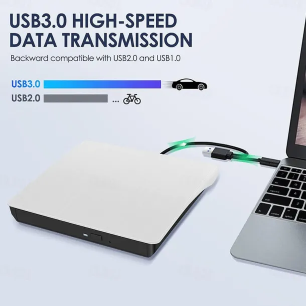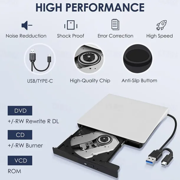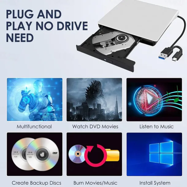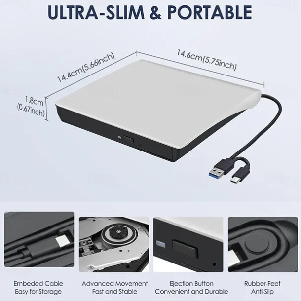 External CD/DVD Drive – USB 3.0 & Type-C Portable Burner Writer Reader for Laptop, Compatible with MacBook Pro/Air, iMac, Windows 7/8/10/XP/Vista​