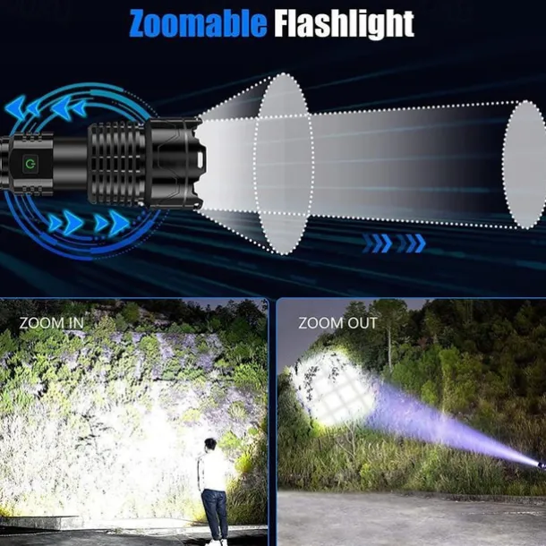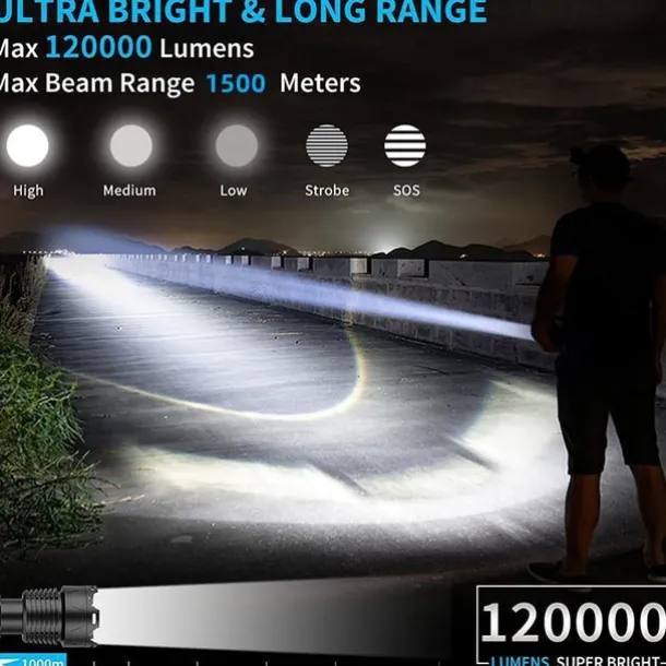 1. Upgrade LED Chip & Brighter: This flashlight is equipped with a high-quality xhp160 chip, providing ultra-high brightness of up to 120,000 lumens, making it 30 times brighter than ordinary flashlights. It can easily illuminate large areas or focus on objects from a distance.