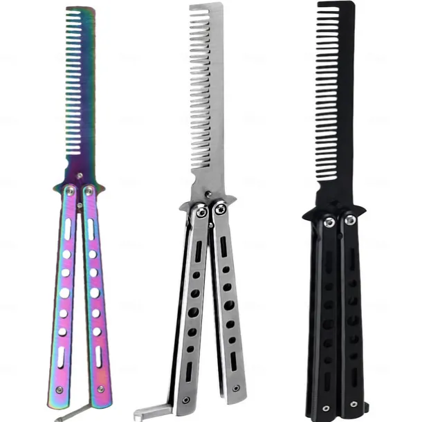 Foldable Comb Stainless Steel Practice Training Butterfly Knife Comb Beard Moustache Brushes Hairdressing Styling Tool