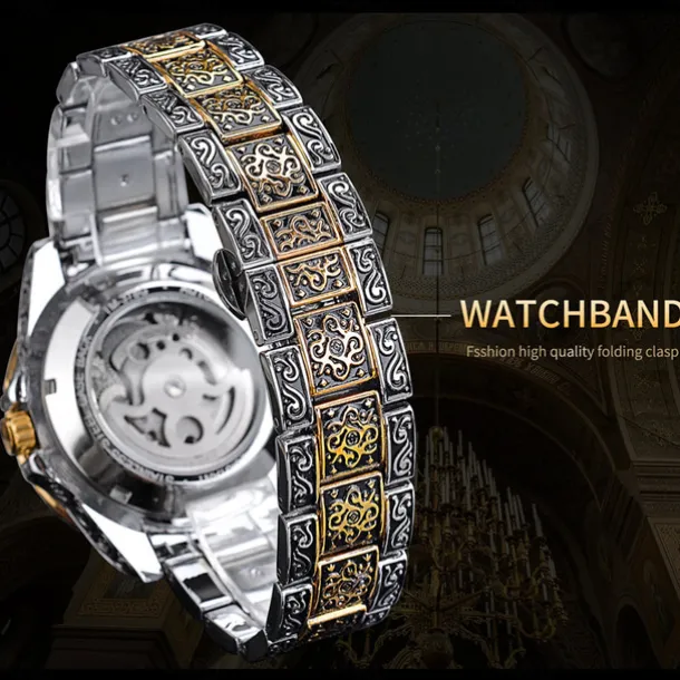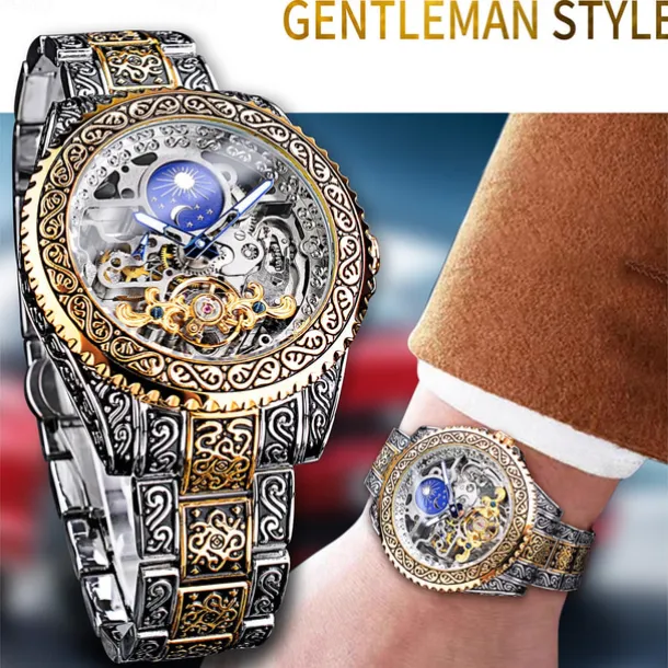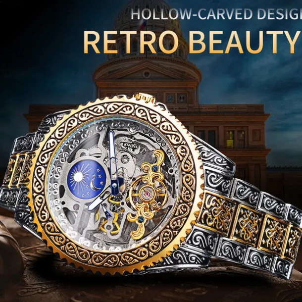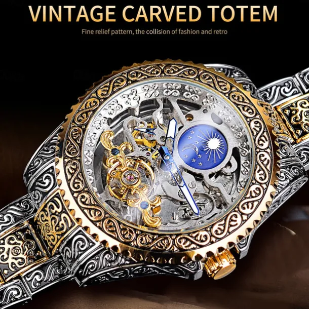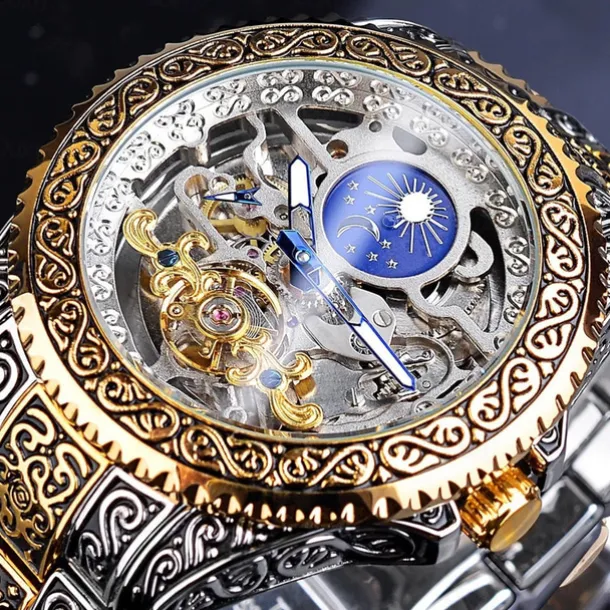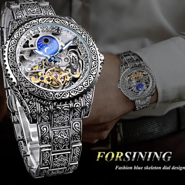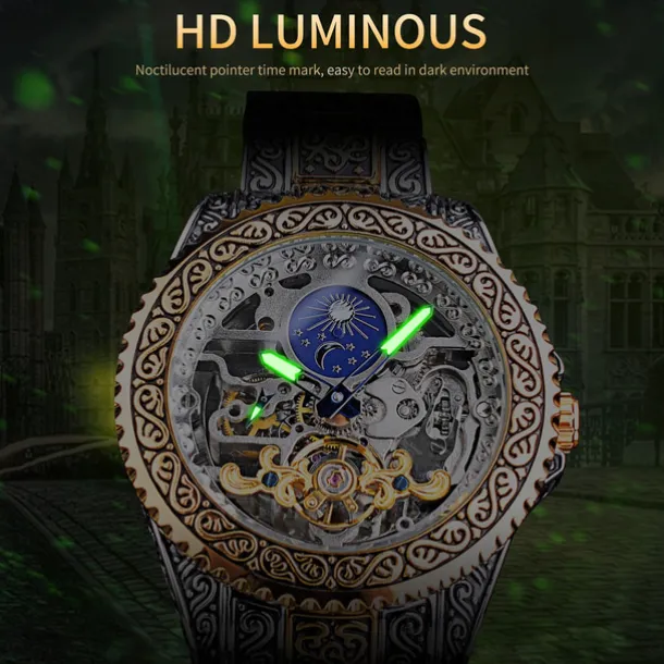 FORSINING Men Mechanical Watch Retro Vintage Luxury Large Dial Fashion Hollow Skeleton Automatic Self-winding Moon phase Luminous Stainless Steel Strap Watch