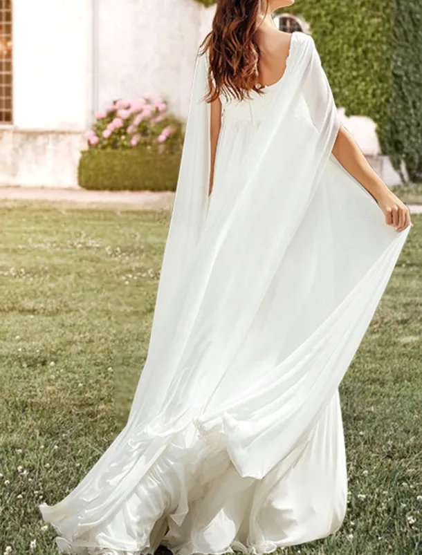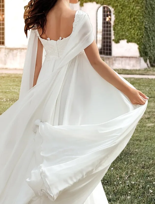 Hall Casual Wedding Dresses A-Line Square Neck Sleeveless Sweep / Brush Train Chiffon Bridal Gowns With Pleats Appliques