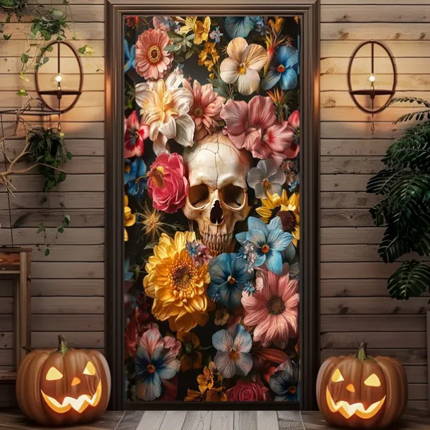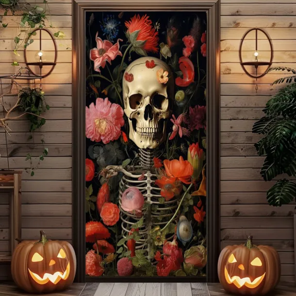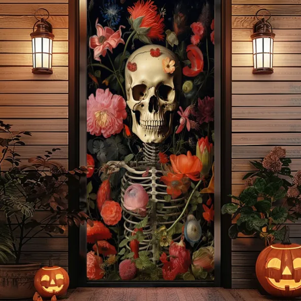 Halloween Door Cover Outdoor Banners Skeleton Flower Psychedelic Dark Punk Gothic Style Party Outdoor Shooting Backgrounds Front Door Wall Porch Decorations Wall Door Background