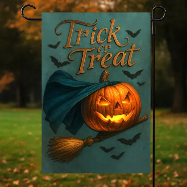 Halloween Garden Flag Banner – “Trick or Treat” Pumpkin with Witch’s Broom, Double-Sided Weather-Resistant Yard Flag for 2025 Halloween Holiday Outdoor Lawn, Porch Decoration
