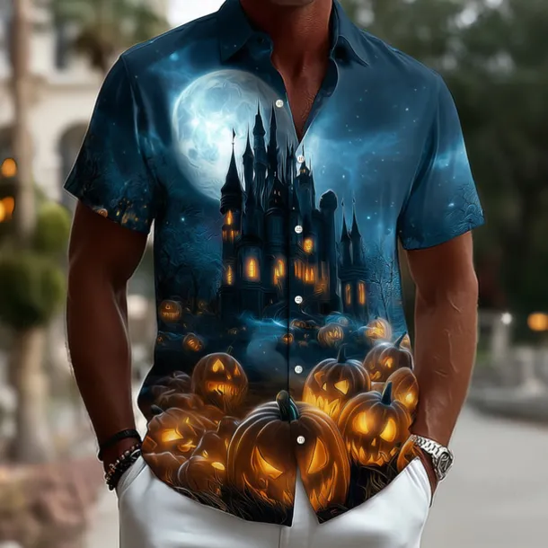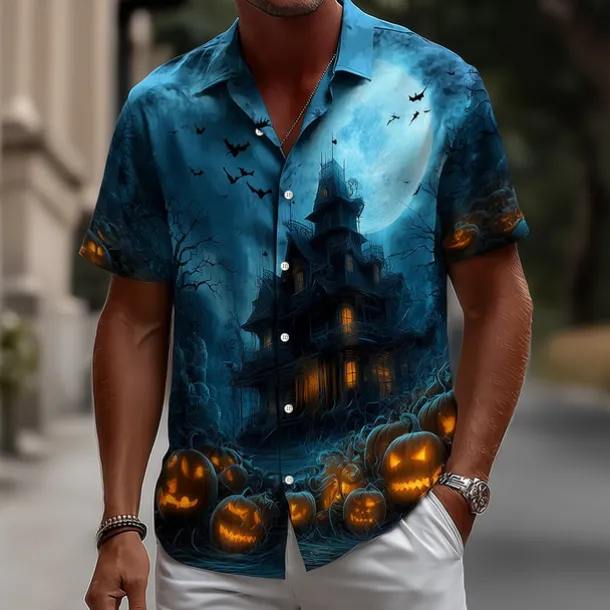 Halloween Men’s Pumpkin Haunted House Halloween Costumes Shirt Button Up Shirt Short Sleeve Dark Punk Gothic Style Holiday Streetwear Summer Spring Turndown 3D Print Collared Shirts Blue 2# Blue 1